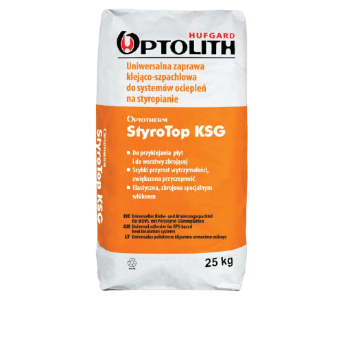 Do wykonywania warstwy zbrojącej na styropianie w systemach ociepleń oraz przyklejania płyt styropianowych. Optotherm StyroTop KSG jest elementem systemu ociepleń Optotherm 2000 i 2001. Doskonale nadaje się do przyklejania elementów ozdobnych (bonie, gzymsy).