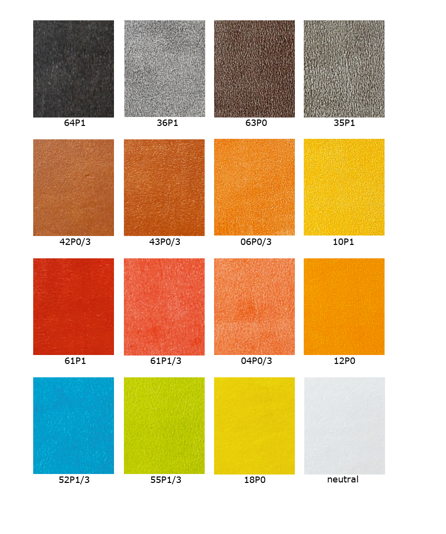 UWAGA: Prezentowane barwy należy traktować jedynie poglądowo, gdyż na ocenę koloru wpływ mają np. ustawienia monitora (wyświetlacza), oświetlenie zewnętrzne – dlatego sugerujemy, by ostatecznego wyboru dokonać korzystając ze wzornika lub tablicy, które prezentują rzeczywiste próbki koloru.