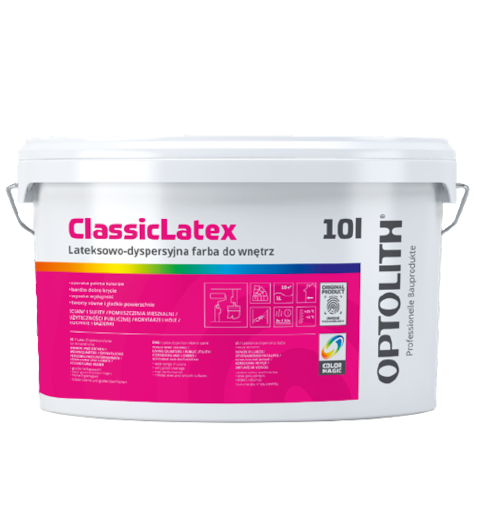 Classic Latex to dostępna w szerokiej gamie kolorów matowa, lateksowo-dyspersyjna farba do dekoracyjnego i ochronnego malowania wnętrz pomieszczeń. Jest łatwa w malowaniu, wysokowydajna. Tworzy równe i gładkie powierzchnie.