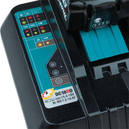 • Ładuje dwa akumulatory równocześnie w tym samym czasie co model DC18RC jeden akumulator