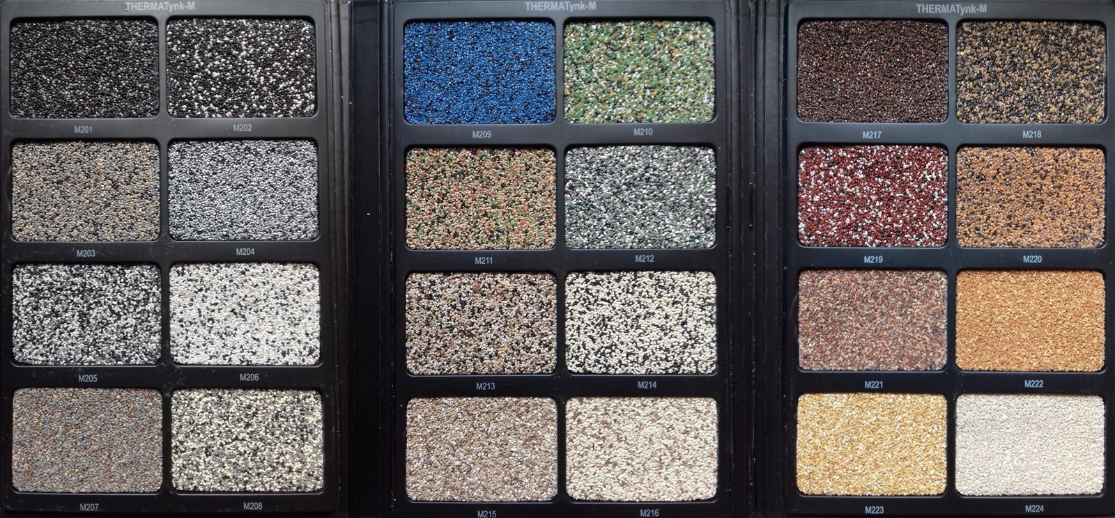 Poniżej prezentujemy paletę dostępnych wzorów tynków mozaikowych THERMATynk-M.