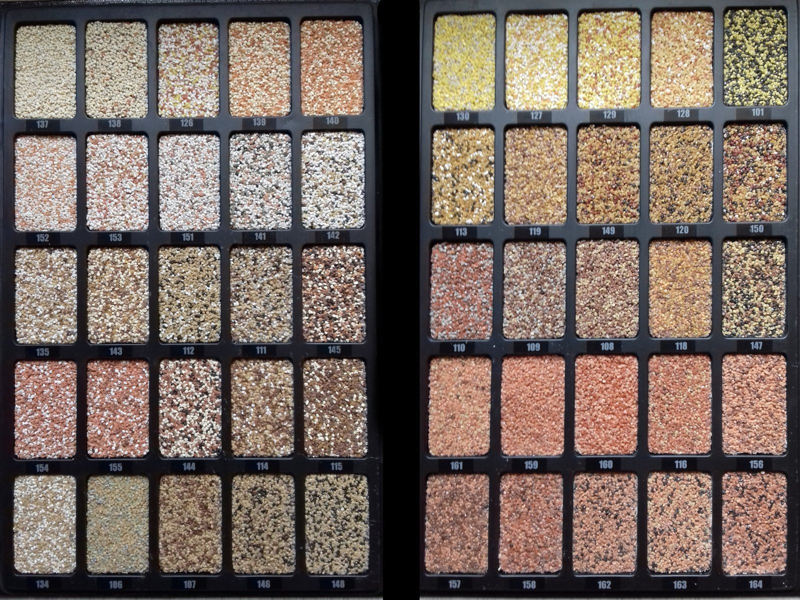 UWAGA: Prezentowane wzory-melanże należy traktować jedynie poglądowo, gdyż na ocenę wzoru wpływ mają np. ustawienia monitora, oświetlenie – dlatego sugerujemy, by ostatecznego wyboru dokonać korzystając ze wzornika lub tablicy, które prezentują rzeczywiste próbki wzorów-melanży tynku mozaikowego THERMATynk-M.