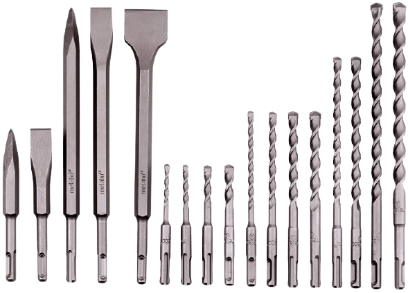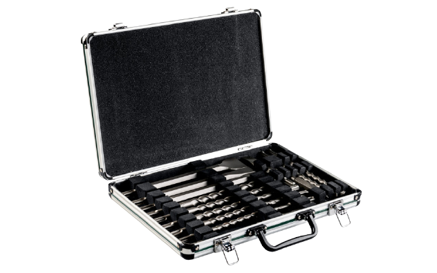 Zestaw wierteł/dłut SDS-plus ""SP"", 17-częściowy, w aluminiowej walizce. Wiertło SDS-plus z wysokiej jakości wiertłem z węglika spiekanego␍. Dynamiczna główka w kształcie dłuta. Duża objętość geometrii S-spirali do szybkiego transportu pyłu. Dobra wydajność wiercenia przy dobrej żywotności. Do stosowania w betonie, murze, kamieniu naturalnym.