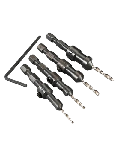 • Zestaw 4 wierteł z pogłębiaczami/uchwytami hex 1/4"