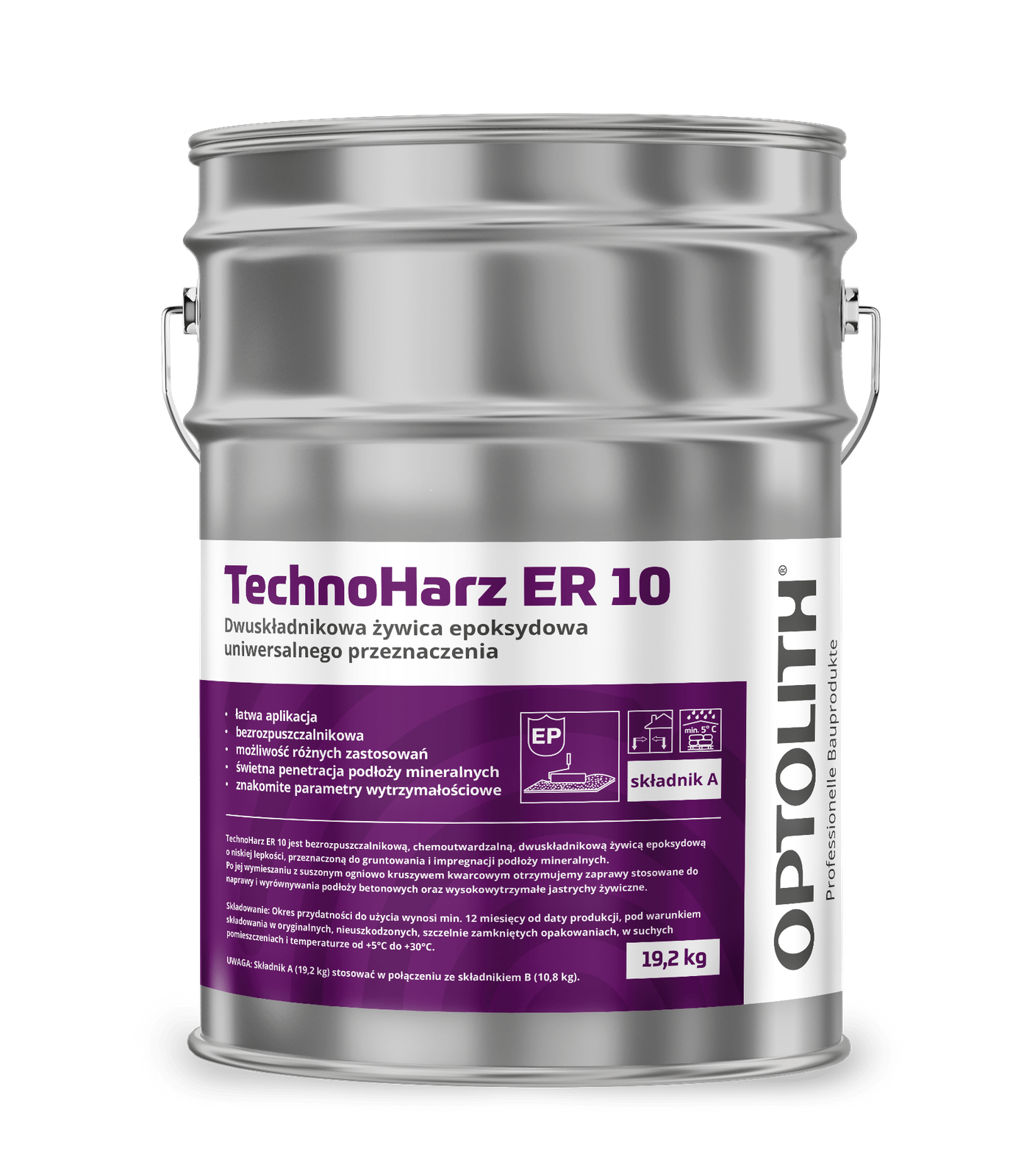 TechnoHarz ER 10 jest bezrozpuszczalnikową, chemoutwardzalną, dwuskładnikową żywicą epoksydową o niskiej lepkości, przeznaczona do gruntowania i impregnacji podłoży mineralnych. Po jej wymieszaniu z suszonym ogniowo kruszywem kwarcowym otrzymujemy zaprawy stosowane do naprawy i wyrównywania podłoży betonowych oraz wysoko wytrzymałe jastrychy żywiczne.