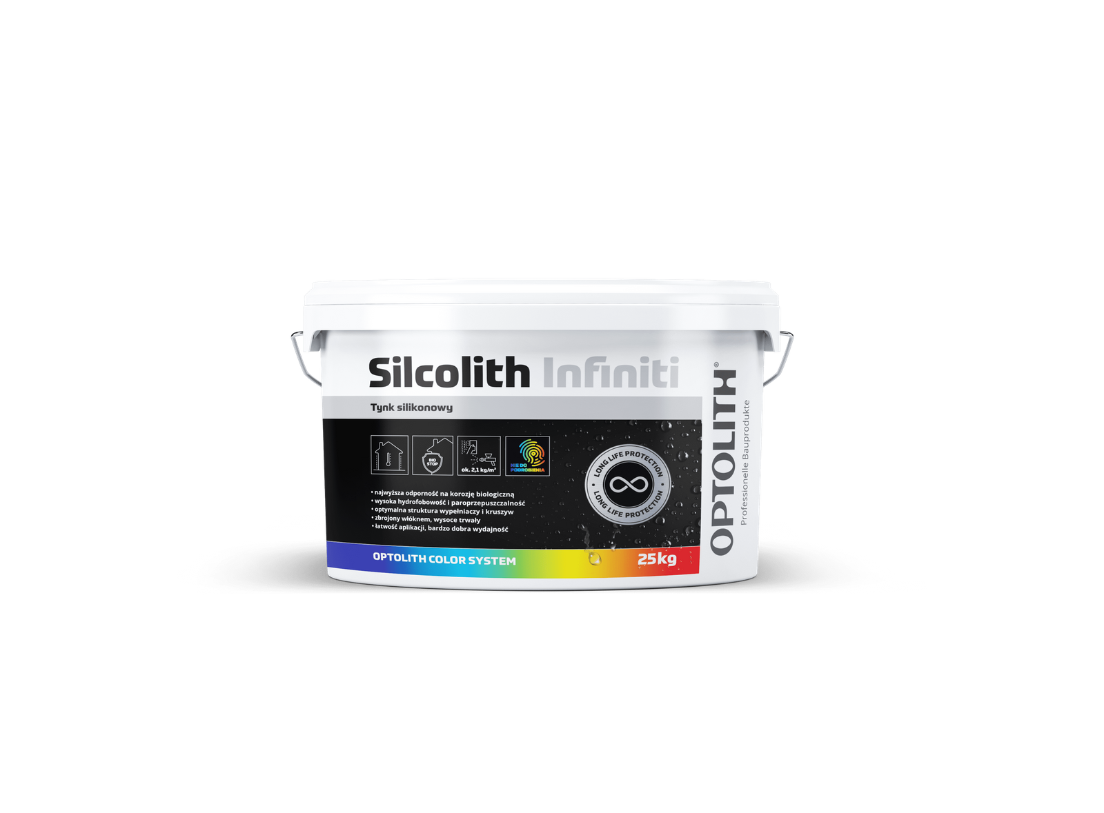 Silcolith Infiniti to najwyższej jakości cienkowarstwowy tynk do wykonania warstwy dekoracyjno-ochronnej w systemie ETICS opartym na wełnie mineralnej lub styropianie. Produkt jest gotową do użycia masą tynkarską o strukturze „baranka”, na bazie spoiwa silikonowego ze specjalnie dobranymi wypełniaczami mineralnymi, pigmentami, modyfikatorami i włóknami zbrojącymi. Receptura i skład produktu są tak dobrane, aby zapewnić maksymalna ochronę przed porastaniem oraz efekt samoczyszczenia, a dodatkowo podwyższoną hydrofobowość, paroprzepuszczalność, elastyczność, wytrzymałość i odporność na warunki środowiskowe.