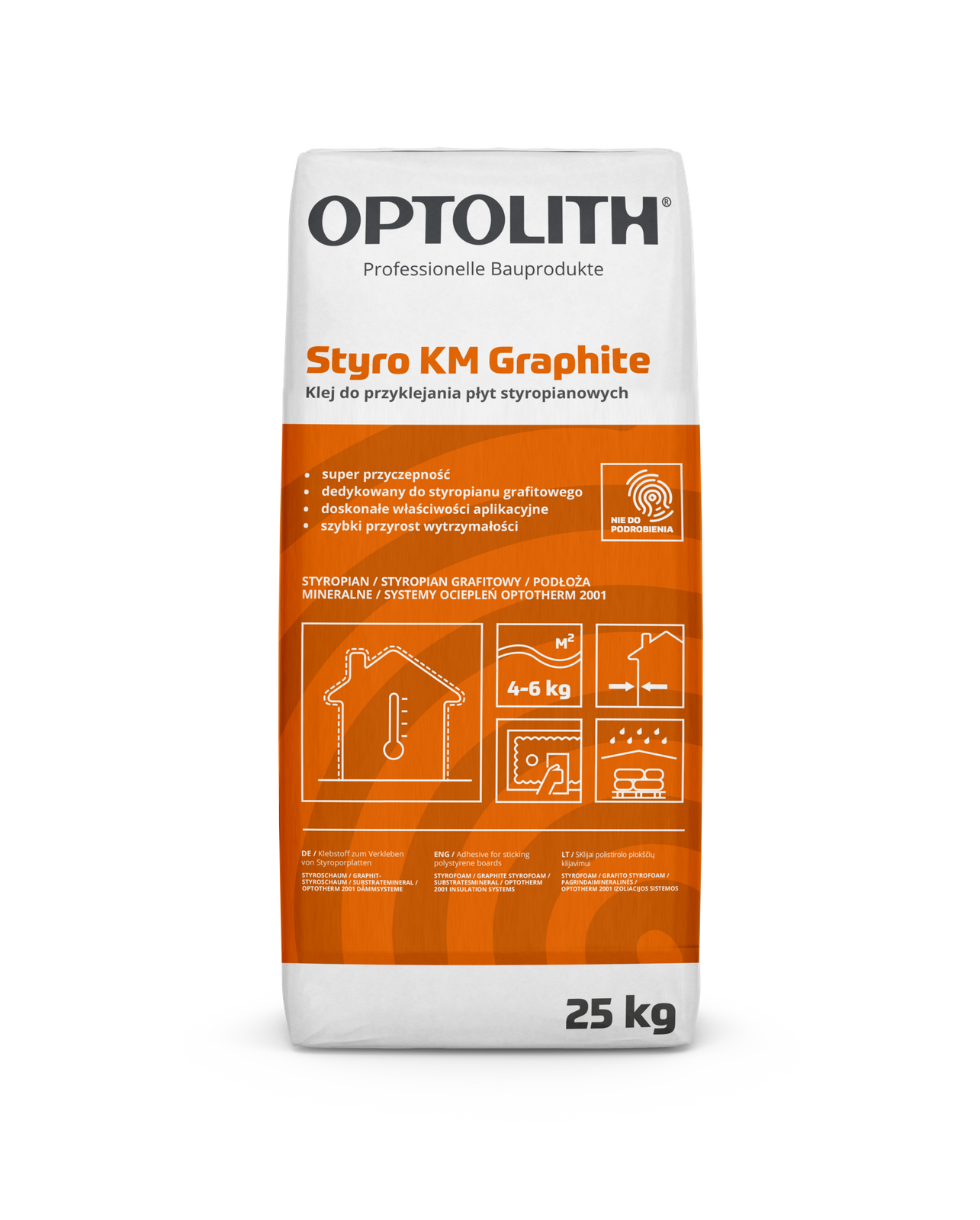 Styro KM Graphite jest suchą zaprawą klejową do styropianu, wytwarzaną jako mieszanka cementu i piasku kwarcowego, wzbogacona surowcami chemicznymi na bazie organicznej. Produkt zalecany do przyklejania płyt ze styropianu grafitowego.
