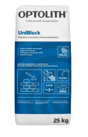 UniBlock jest fabrycznie przygotowaną cienkowarstwową zaprawą murarską na bazie wyselekcjonowanych kruszyw, wysokojakościowych cementów i dodatków, gotową do użycia po dodaniu wody.