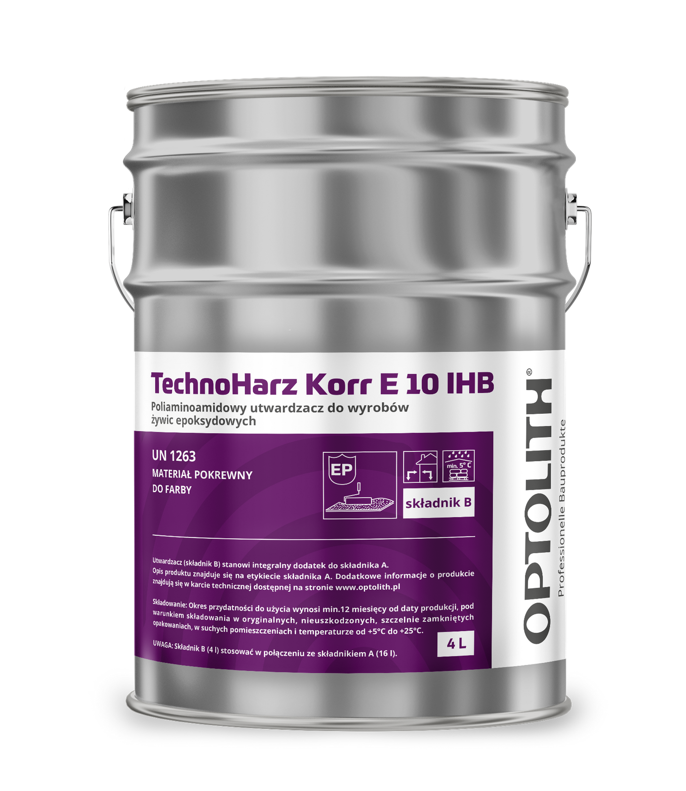TechnoHarz Korr E 10 IHB jest specjalnym, szybkoschnącym, grubopowłokowym, dwuskładnikowym, uniwersalnym gruntem epoksydowym utwardzanym poliaminoamidem, pigmentowanym antykorozyjnie fosforanem cynku. Materiał stosowany również jako podkład wypełniający do szybkiego przemalowania.