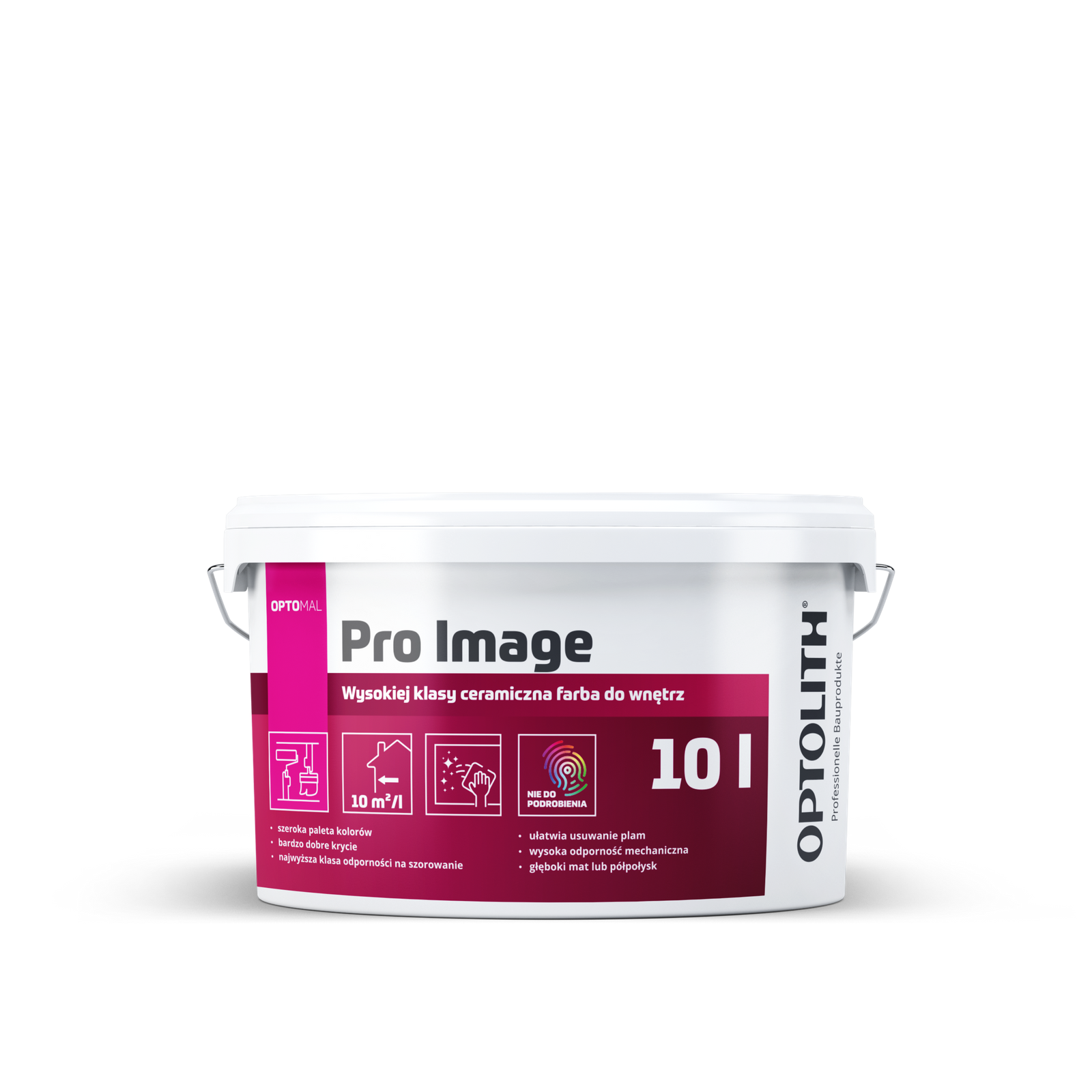 Pro Image to wysokiej jakości ceramiczna farba dostępna w szerokiej gamie kolorów, o wykończeniu głębokiego matu lub półpołysku. Wysoce odporna na zmywanie i szorowanie, ułatwia usuwanie plam. Ze względu na wyjątkowe właściwości i trwałość, farba jest polecana do malowania pomieszczeń szczególnie narażonych na zabrudzenia takich jak np.: ciągi komunikacyjne, korytarze, pomieszczenia prywatne, biurowe i służby zdrowia, salony i aneksy jadalne. Jest łatwa w malowaniu, wysokowydajna.